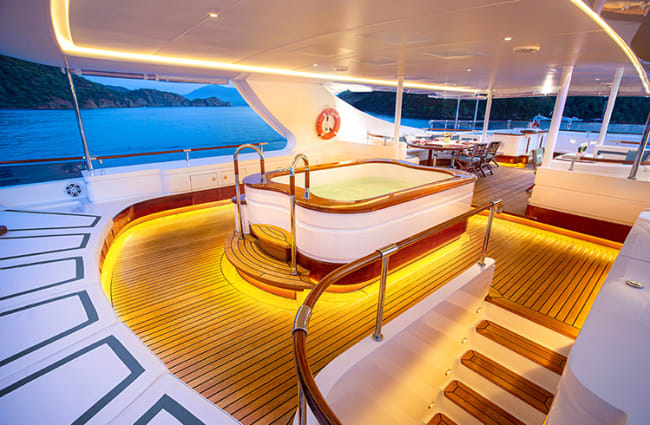 Outside of your cabins, the onboard social spaces are equally inviting, not least the panoramic main lounge, distinguished by its beam-to-beam windows, a huge U-shaped sofa, and two large flatscreen televisions. The teakwood sun deck has outdoor seating with a wraparound lounge sofa, a six-person jacuzzi, and convertible workout zones. Big TV screens are positioned on either side of the jacuzzi. The vessel also features a Beach Club, located at water level on the lower deck, which incorporates a swimming platform from which many excursions are launched; it has a wraparound sofa, picture windows, and a flatscreen TV.