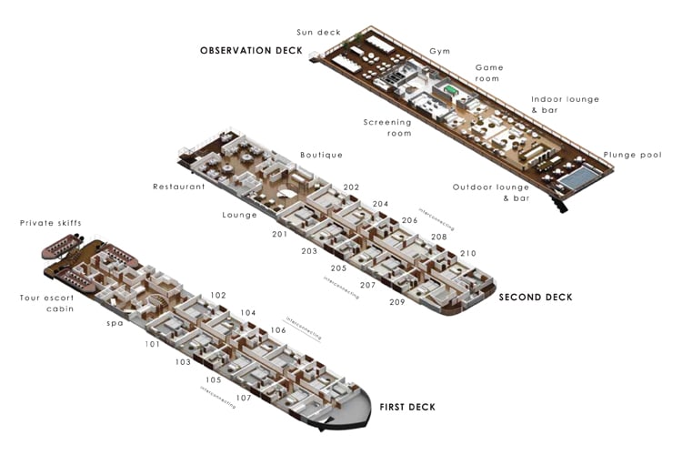 The riverboat is also home to a range of social spaces, including outdoor lounges at the bow and stern. Sip your favorite cocktails at two bars, one outdoors and the other at the indoor lounge. There is also a private screening room with a selection of classic films set in the Amazon and a gym with floor-to-ceiling windows. When it’s time to unwind, hop into the outdoor infinity plunge pool, or book an appointment at the spa for a relaxing massage.