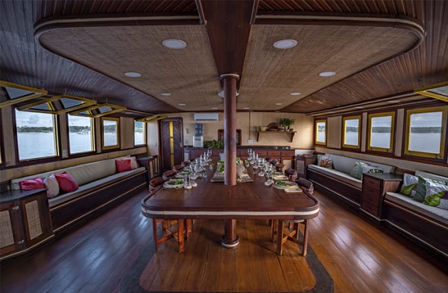The third deck is where social life flourishes. Here, you’ll find four standard double cabins, each with a small double bed (this time without the single berth above) and private bathroom, and a mix of indoor and outdoor common areas perfect for relaxing or socializing. The air-conditioned lounge bar is ideal for reading or enjoying a handcrafted cocktail, while the adjacent semi-open balcony lounge offers shaded seating with cooling breezes and unforgettable views.