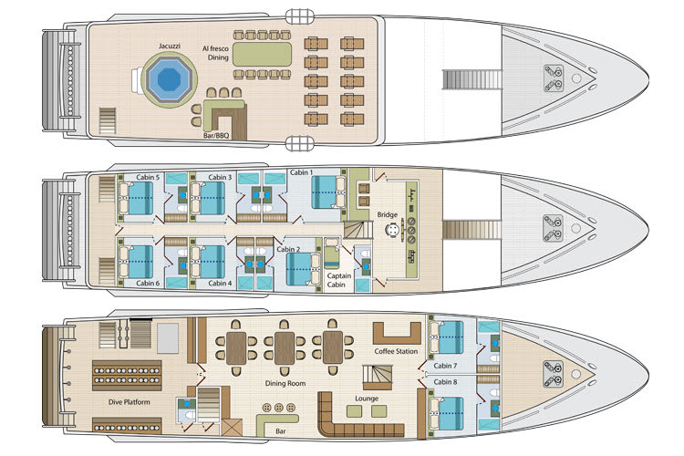 Your comfort and safety, both onboard and off, are of the utmost importance. The Calipso’s ten-person crew is delighted to help with every need. In addition to the boat’s crew, you will also be accompanied by a certified, bilingual guide who will help identify and understand the wildlife of the Galapagos Islands.