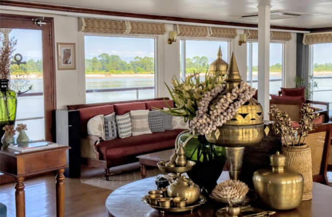 The deluxe cabins, located on the upper deck, offer ample space and a welcoming ambiance reminiscent of Assam's charm. Adorned with touches of colonial elegance, they showcase traditional Assamese designs on hand-woven cotton fabrics, evoking a sense of nostalgia and comfort. Each cabin boasts a private balcony, allowing guests to immerse themselves in the serene surroundings.