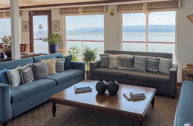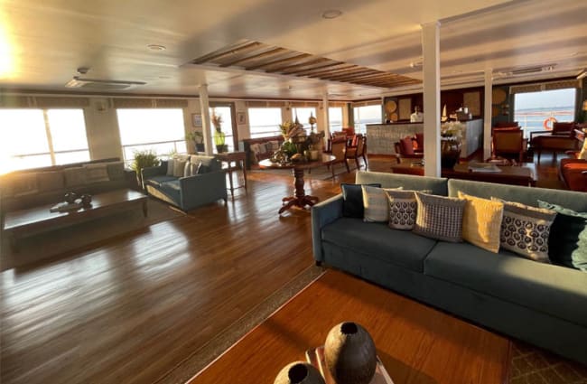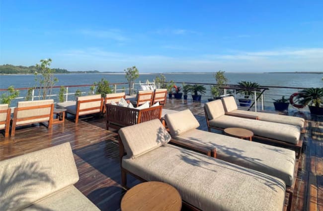The main deck cabins, featuring queen size beds, offer comfort without any additional charge. Reflecting the essence of Assam, the decor combines colonial elegance with traditional Assamese designs on hand-woven cotton fabrics, creating a warm and inviting ambiance. These cabins also include French balconies, providing guests with a charming space to admire the scenery and soak in the atmosphere of the journey.