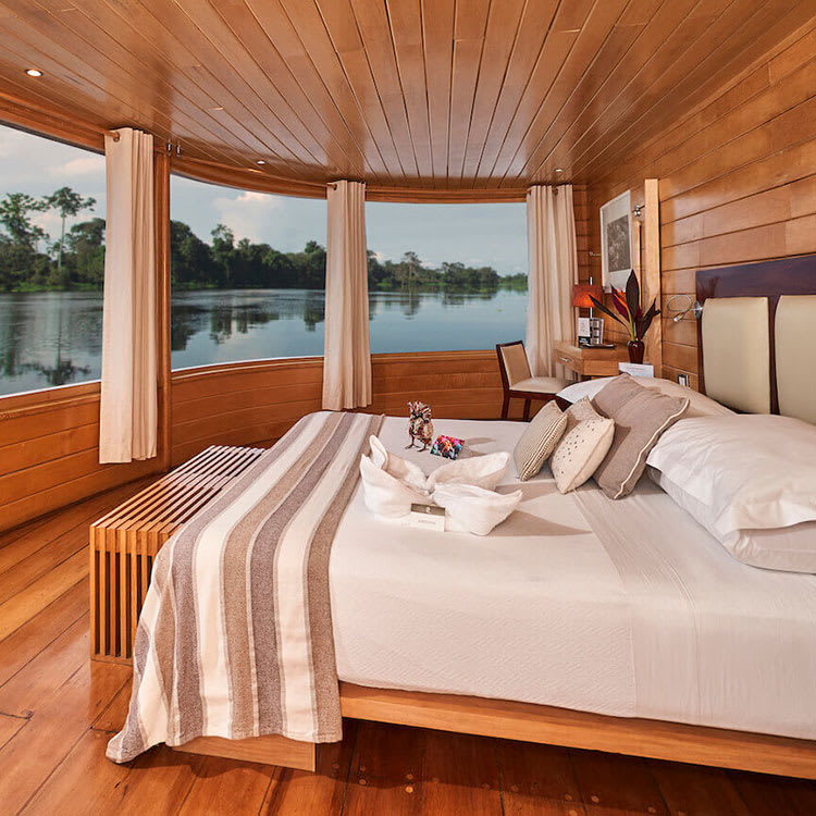 The Standard Suites have extra-large windows that offer you breathtaking views of the Amazon. Two pairs of suites (3 & 5 and 4 & 6) are interconnectable, and suites 1 & 2 can also be set up with a rollaway bed suitable for a child under 12 to cater better to families or groups. The Suites have a welcoming and relaxing environment for those who want to get away from it all. Suites 5, 6, 13 & 14 have 1 King fixed bed while cabins 1,2, 3, 4, 11 & 12 can either be King or Twin.