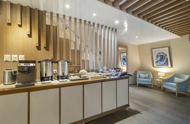 They are incredibly spacious, with two interconnected pairs on the upper deck. The rooms feature a fully equipped bathroom with hot water, hairdryer, body wash, and body lotion. The rooms have a balcony to relax and unwind on as you take in the oceanic scenery.