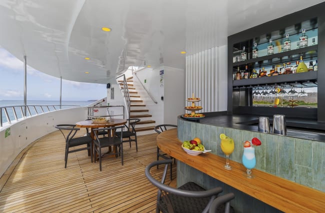 For a drier way to enjoy some wildlife spotting, ease into a comfortable chair on the main deck’s sun terrace at the bow of the ship. It’s the perfect place to watch everything from sea lions to blue-footed boobies. Fuel all of your adventures with meals from locally-sourced ingredients expertly prepared by the ships’ chef. But your favorite meal just might be the BBQ that is served alfresco on the sky deck.