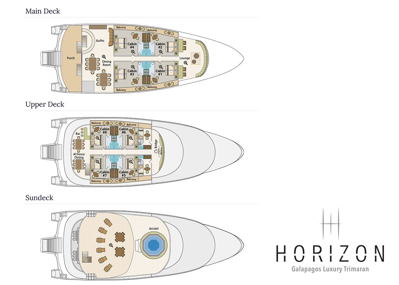The Galapagos Horizon is a motorized trimaran with three hulls, including a large middle hull and a smaller one to each side. This design, unique in the Galapagos, ensures she is a sleek, fast ship that can navigate quickly between islands. However, even at her top speeds of 11 knots, three hulls ensure that the vessel has extra stability. With less ocean motion and no hull vibration, you will enjoy a smooth sail and restful nights.