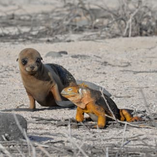 AM: Breakfast service followed by a visit to South Plaza. The rocky trail circumnavigates the island displaying the combination of dry and coastal vegetation zone. South Plaza has one of the largest populations of Land Iguanas in the Galapagos. The iguanas seem to be everywhere once you land. These larger than average yellow‐brown land iguanas feed on the fruit and pads of the prickly pear cactus. South Plaza is also home to Marine Iguanas living along the coast and a Hybrid Iguanas whose fathers are Marine Iguanas and mothers are Land Iguanas.