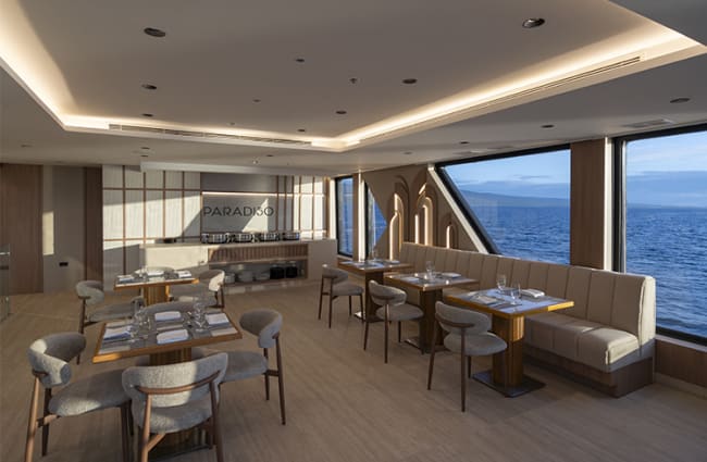Experience the intimacy of a small expedition vessel while reveling in the comfort and spaciousness typically associated with larger cruise ships, as this cavernous catamaran, labeled as “Galapagos’ largest small-cruise vessel”, boasts a wealth of both indoor and outdoor spaces. Whether you’re unwinding in the main bar, listening to your expert naturalist’s presentations in the luxurious lounge with flat-screen TVs, exploring the library, or enjoying a rejuvenating session in the full-service spa, every corner of the vessel exudes elegance and invites you to connect with your fellow adventurers. The sundeck, with its al-fresco dining area and bar, outdoor Jacuzzi, and front facing observation zone, offers breathtaking views and the perfect ambiance for relaxation, whilst the boarding area and aperitif lounge to the rear of the boat on the main and upper decks respectively offer equally inviting seating areas and scenic views.
