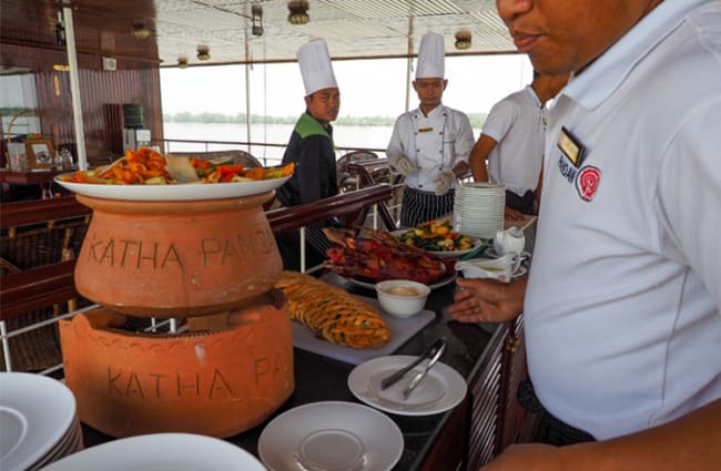 Meals are prepared by a local master chef who heads an experienced international culinary team, using fresh, locally sourced ingredients, and served bistro-style both indoor and outdoor on the Upper Deck. Breakfast and lunch are buffet-style, with sit-down multi-course, themed dinners. Combined with the complimentary evening canapés and daily freshly baked breads from the onboard bakery, the cuisine on board your cruise—in conjunction with the exciting and authentic excursions—really does encompass the Indian lifestyle completely.
