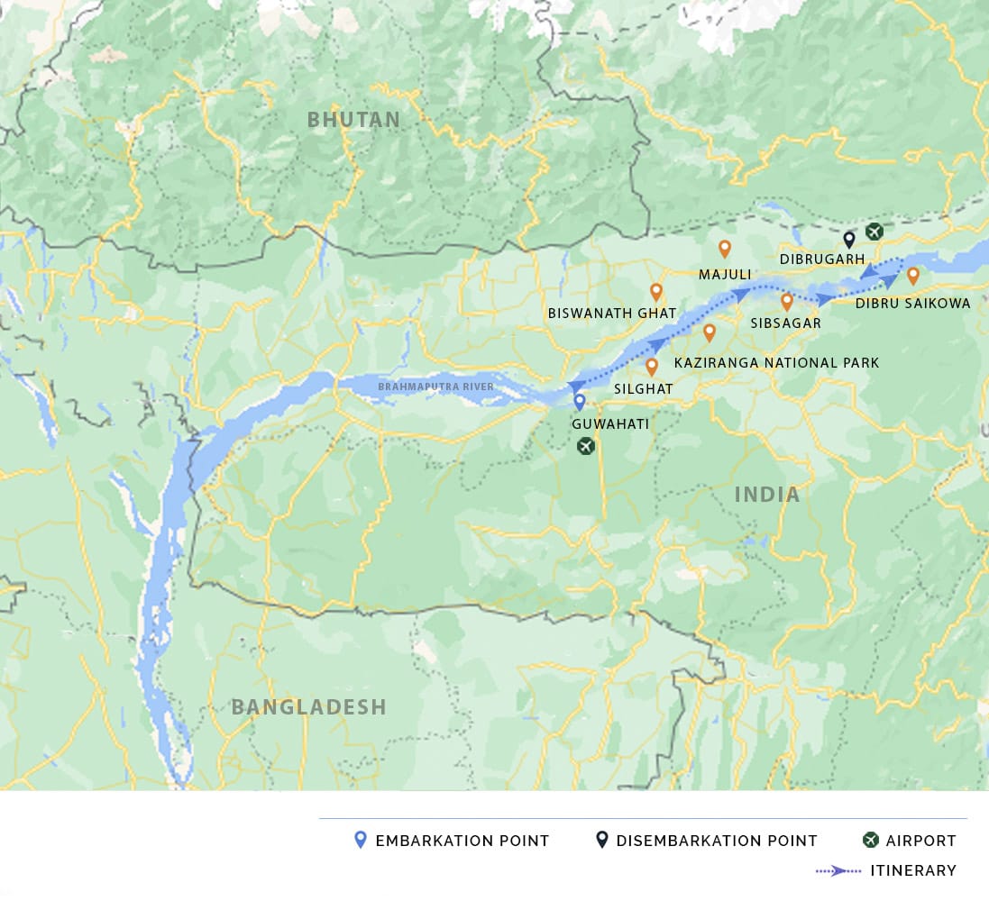 AM: Disembark after breakfast and transfer to your hotel or Guwahati airport (15km / 30 min). Transfers can be arranged as per your flight details with the latest departure from the ship at 10am.
