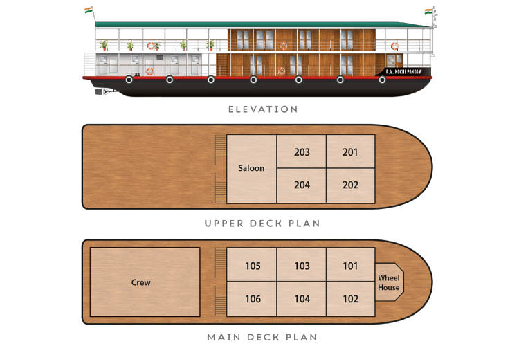 The fruit of an exciting collaboration between premier river cruise operators and Kochi-based specialist naval architects, the RV Kochi Pandaw will have 10 deluxe staterooms—4 upper deck staterooms and 6 main deck staterooms—each 170 square feet (16sqm) in size, finished in teak and brass and featuring panoramic French windows, kimonos and slippers, and spa-branded amenities.