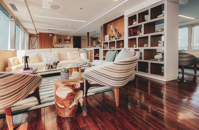 Every inch of the Kontiki yacht has a contemporary style crafted from the finest materials. The vessel aims to help maximize comfort, as is evident in all three stateroom categories. Every ensuite stateroom features upscale fittings and 100% organic cotton linens, and many offer either panoramic windows or terraces. However, you’ll likely want to spend the bulk of your onboard time in the ship’s social areas, including the Organic Bar, Chill Parlour, Jacuzzi, and solarium.