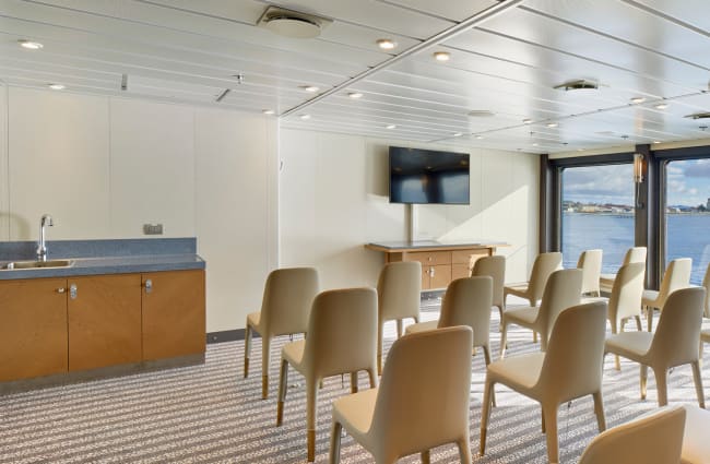 Social spaces are thoughtfully designed for relaxation and enrichment, including a spacious, glass-enclosed observation lounge, a well-stocked bar, library and medical clinic, as well as a dining room serving gourmet meals inspired by regional flavors. The onboard team of expert naturalists and guides offers engaging lectures and workshops held in the ship’s presentation room with state-of-the-art audio-visual equipment, enhancing the educational aspect of the voyage.