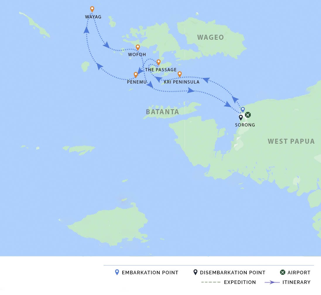 PM: After lunch, we head to Dayang Island, where we dedicate the afternoon to relaxation and water activities. Enjoy our last Raja Ampat sunset surrounded by the sounds of the rainforest. In the afternoon, Mutiara Laut embarks on a crossing to Sorong where we will arrive in the night.