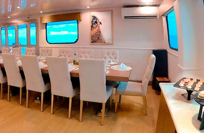 The Galapagos Seaman Journey has six twin cabins located on the main deck. These cabins offer great comfort with twin beds, a private bathroom, hair dryer, safe, table-lamps and air conditioning. The windows in the cabins offer guests a pleasant panoramic view of the Galapagos landscape.